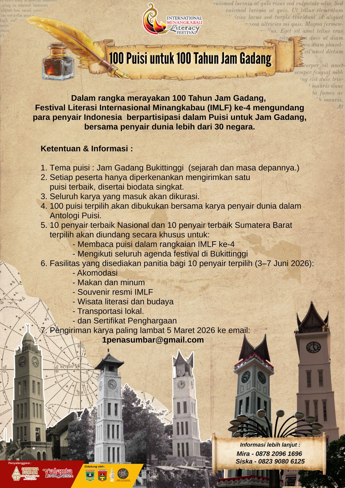 PADANG– SatuPena Sumatera Barat dan Yayasan Sumbar Talenta Indonesia (YSTI) akan menyelenggarakan Festival Literasi Internasional Minangkabau ke-4 (IMLF) pada 3-7 Juni 2026, di Kota Bukittinggi, Provinsi Sumatera Barat untuk merayakan 1 (satu,) abad Jam Gadang.