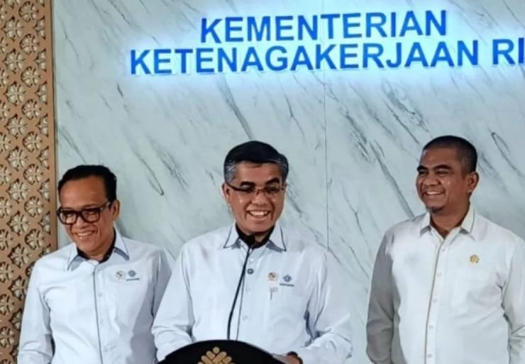 Menteri Ketenagakerjaan (Menaker) Yassierli (tengah), dan Wakil Menteri Ketenagakerjaan (Wamenaker) Immanuel Ebenezer (kiri) dalam konferensi pers penyaluran bantuan subsidi upah (BSU) di Jakarta, Selasa (24/6/2025).