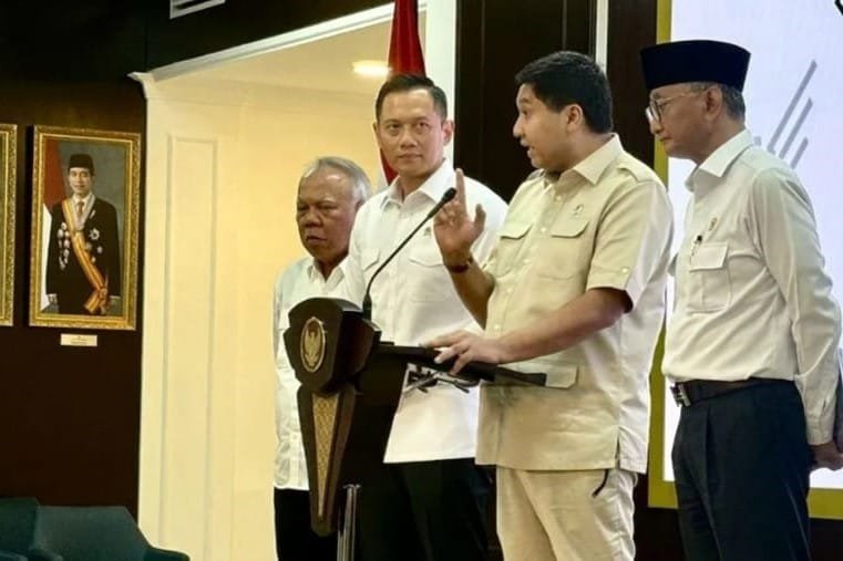 Dari Kiri ke kanan, Ketua Otorita IKN,Basuki Hadi Mulyono, Menko Infra, AHY, Menteri PKP,Ara,dan Menteri PU,Dody, saat menberi keterangan pada media,Selasa malam di Istana usai ratas.