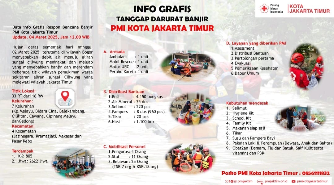 Banjir ini berdampak pada 1.362 KK atau 2.622 jiwa. PMI Kota Jakarta Timur mengerahkan armada dan personel, termasuk 1 unit ambulans, 1 unit mobil rescue, 2 unit motor URC, dan 1 unit perahu karet. Bantuan yang telah didistribusikan antara lain 4.150 bungkus roti, 75 dus air mineral, 220 pcs selimut, 8 dus pampers (960 pcs), 20 pcs tikar, dan 1.100 box nasi.
